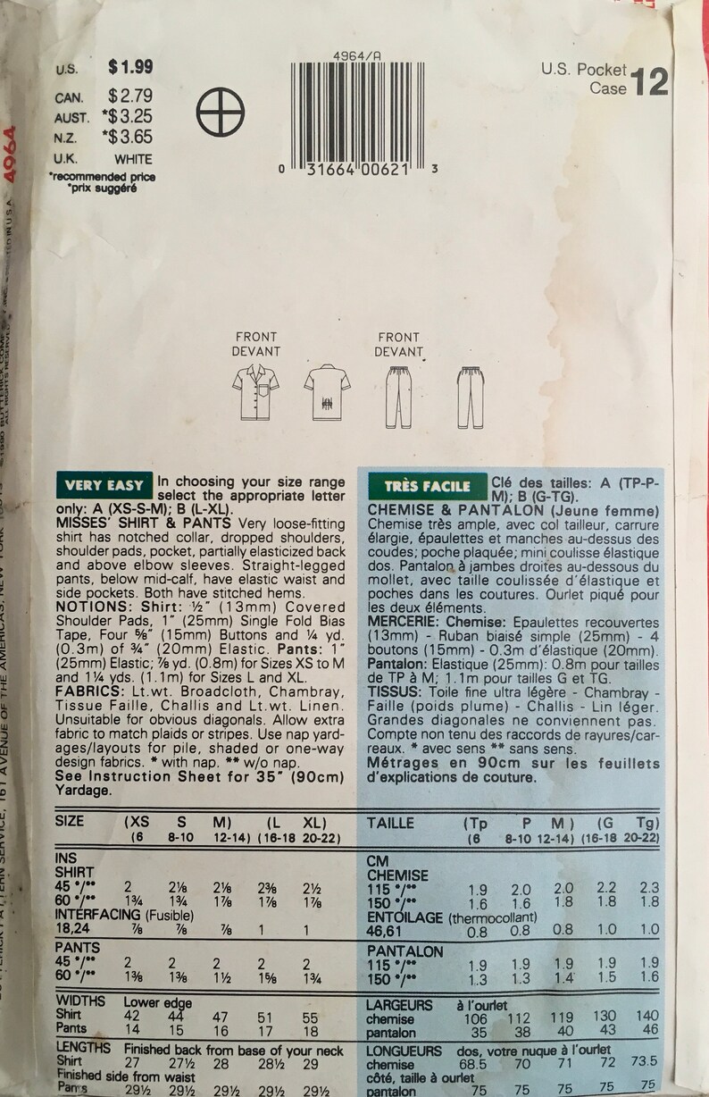 4964 sewing pattern pants. 45 out of 5 stars. Pattern envelope has shelf wear and writing as shown. Hard to find pattern.